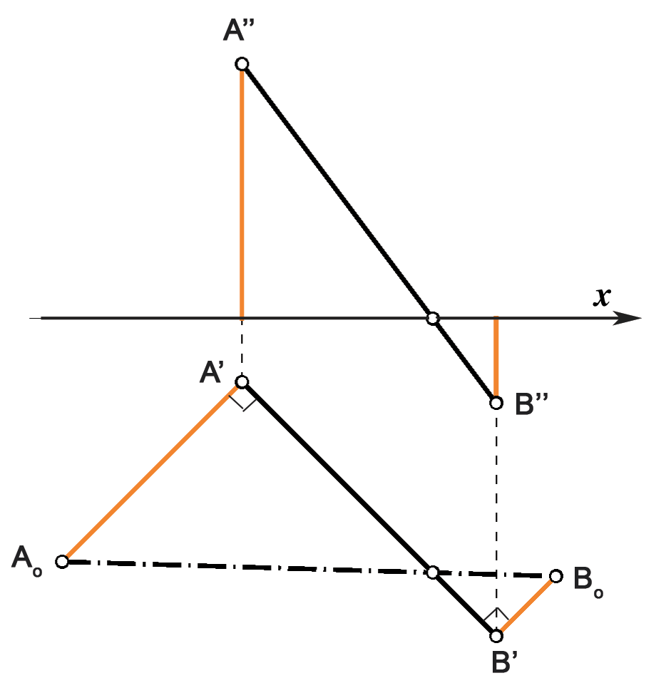 Određivanje duljine neke dužine \(\small\overline{AB}\) na temelju njezinih projekcija (\(\small\overline{A'B'}\),\(\small\overline{A''B''}\)) vrlo je važan metrički zadatak. Rješavamo ga na sljedeći način:
