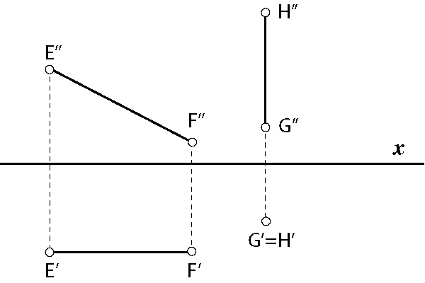 - Tlocrt i nacrt neke dužine \(\small\overline{AB}\), koja ne leži na zraci projiciranja, uvijek su neke dužine \(\small\overline{A'B'}\) i \(\small\overline{A''B''}\) (slika 100).