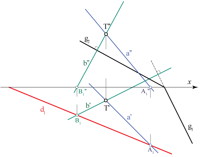 - Na pravcu \(\small a\) odaberemo bilo koju točku \(\small T\) i konstruiramo projekcije pravca \(\small b\) koji prolazi tom točkom, a okomit je na \(\small\Gamma\)