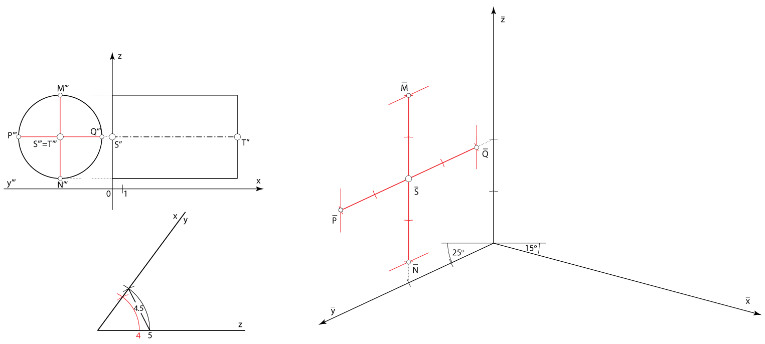 - Konstruiramo kut proporcionalnosti za prikrate na osima \(\small{x}\) i \(\small{y}\) te projekciju središta one osnovke valjka koja leži u \(\small{\Pi_3}\)