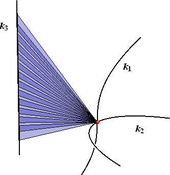Međutim, ako se primjerice ravnalice \(\small k_1\) i \(\small k_2\) sijeku u jednoj točki, tada svi pravci koji prolaze tom točkom, a sijeku krivulju \(\small k_3\), pripadaju plohi i formiraju stožac reda \(\small n_3\). Pravčasta se ploha raspada na stožac reda \(\small n_3\) i ostatak koji je reda \(\small 2\cdot n_1\cdot n_2\cdot n_3-n_3\). Upravo je taj ostatak ono što smatramo izvedenom pravčastom plohom i što konstruktivno obrađujemo.