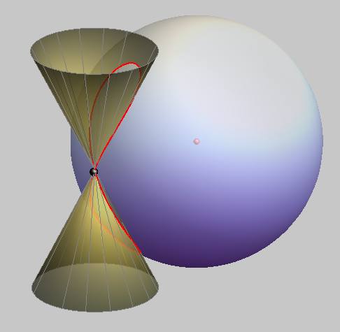an intersection curve with ONE DOUBLE POINT The sphere passes through the vertex of the cone. |