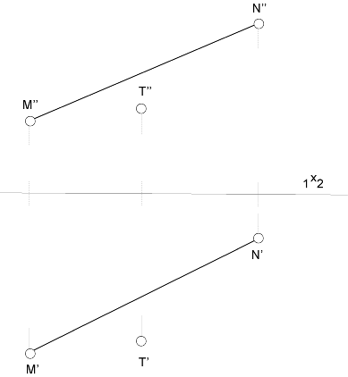 Zadatak 1.9. Konstruirajte projekcije rotacijskog valjka kojemu je dužina MN os, a T točka na plaštu. |