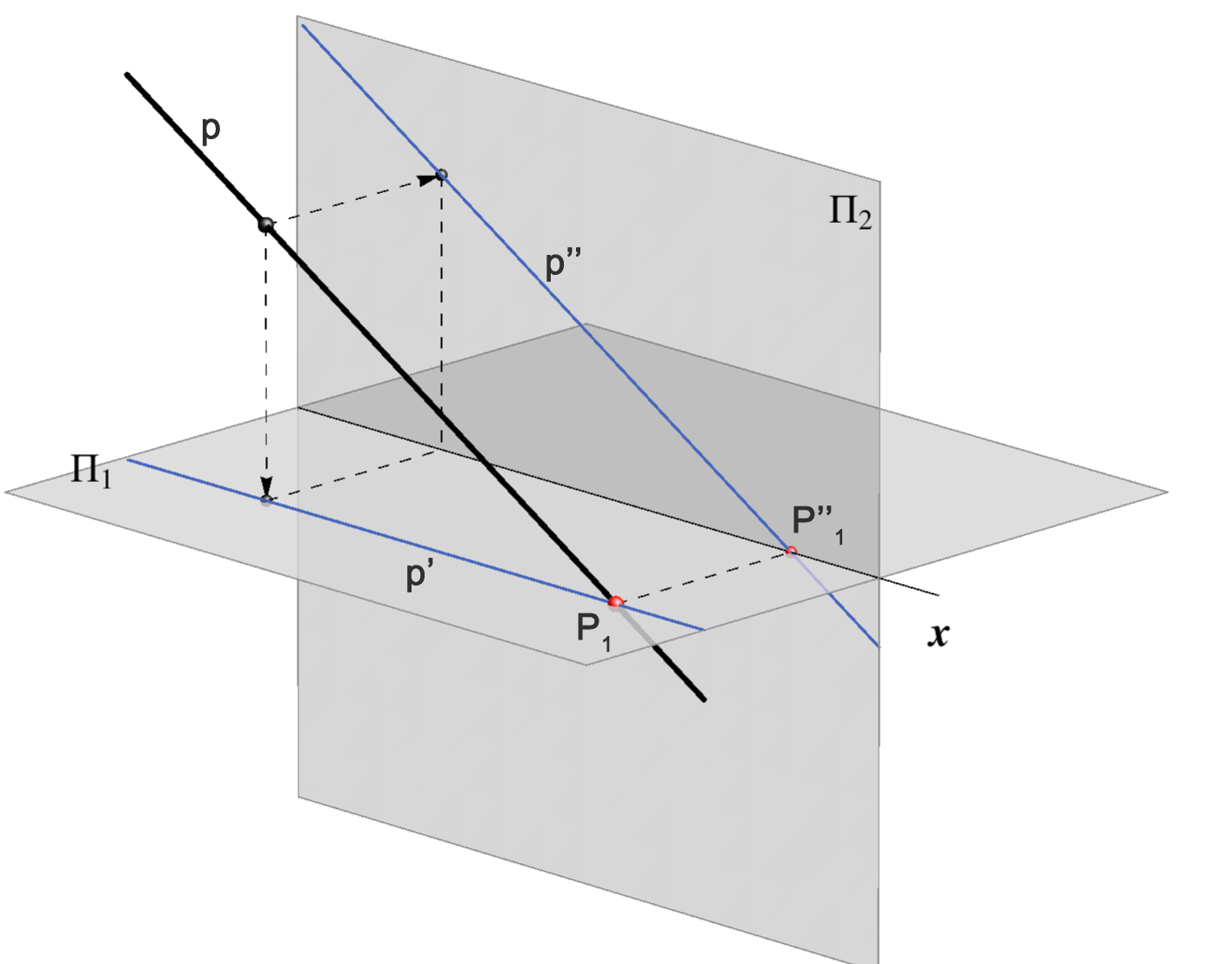 Ako pravac \(\small p\) nije zraka projiciranja (u Mongeovom projiciranju zrake su okomite na ravnine projekcije) njegov su tlocrt i nacrt pravci \(\small p'\) i \(\small p''\).