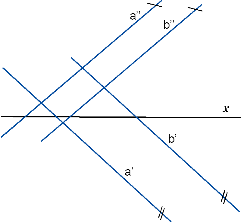 - Ako su pravci \(\small a\) i \(\small b\) paralelni, tada su paralelne i njihove odgovarajuće projekcije, odnosno \(\small a\parallel b\Longrightarrow a'\parallel b'\, \land \,a''\parallel b''\).