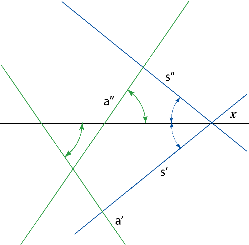 - Ako je pravac paralelan s ravninom simetrije, tada njegov tlocrt i nacrt zatvaraju jednake kutove (suprotno orijentirane) s osi \(\small x\).